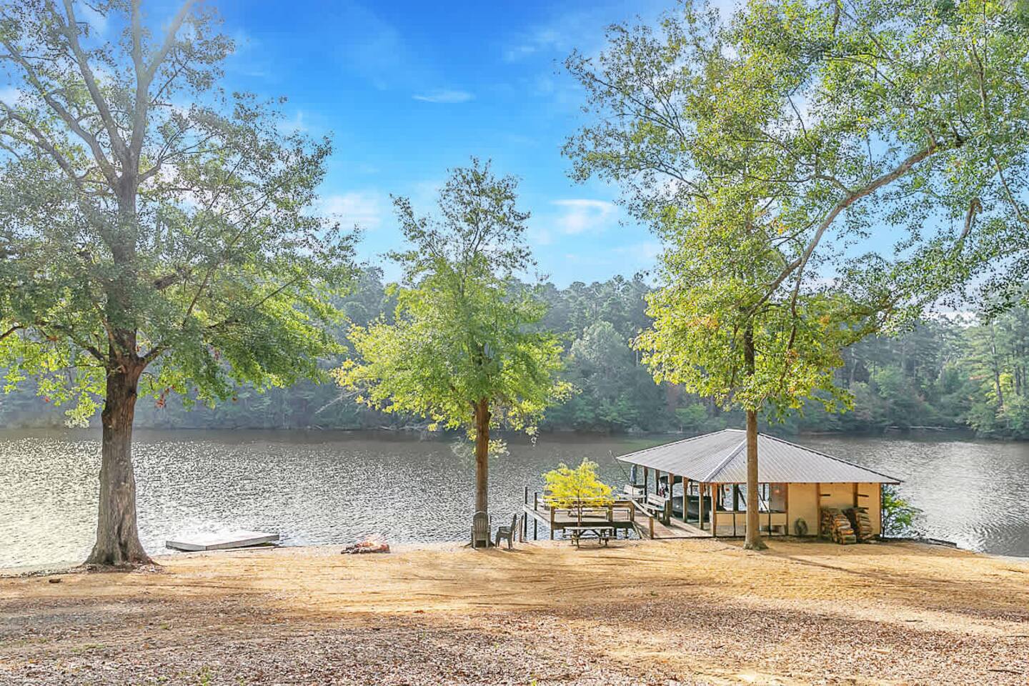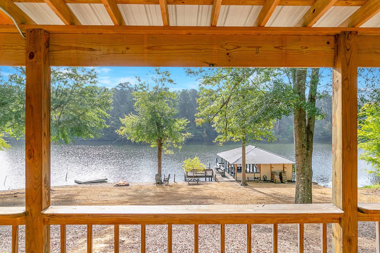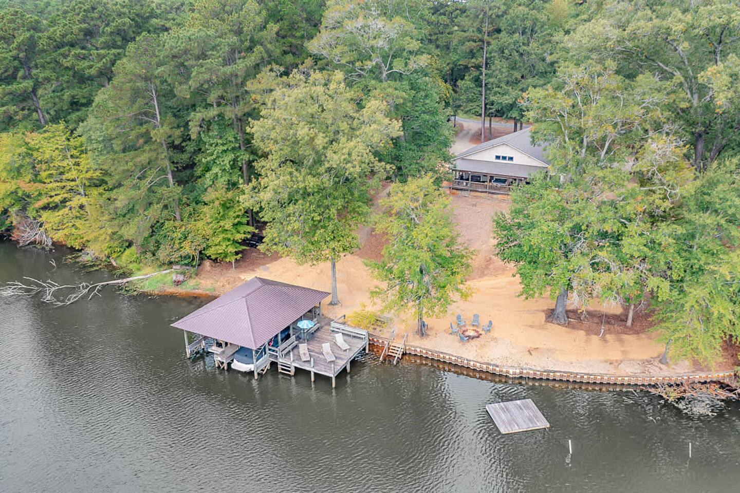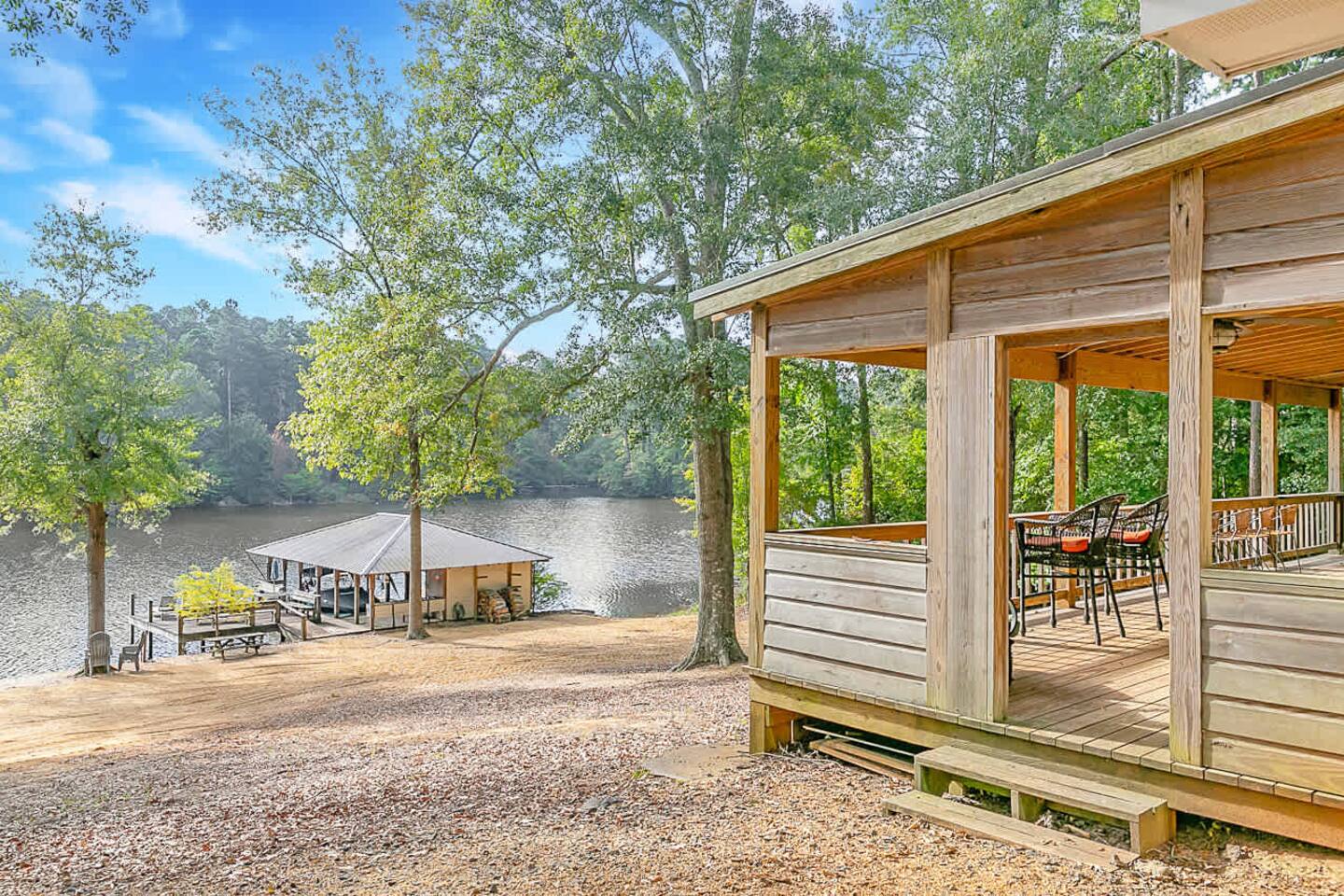 This spacious 4-bedroom lakefront home on beautiful Lake Claiborne is designed with comfort and convenience in mind—perfect for large families, reunions, or group getaways. With sleeping accommodations for up to 20 guests and king beds throughout, everyone will enjoy plenty of room to relax and unwind. Inside, you’ll find a fully equipped kitchen featuring double refrigerators—ideal for storing meals and drinks for large groups—and a double washer and dryer setup to make extended stays easy. The open layout provides ample space to spread out for family meals or gatherings, and the back patio offers a peaceful spot to enjoy your morning coffee or an evening meal while taking in the lake views. Stay connected and entertained with high-speed internet and satellite TV, or step outside to experience the natural beauty of this secluded cove. Whether you’re relaxing on the porch, fishing from the dock, or watching the sunset over the water, this home combines modern comfort with lakeside tranquility for an unforgettable stay.