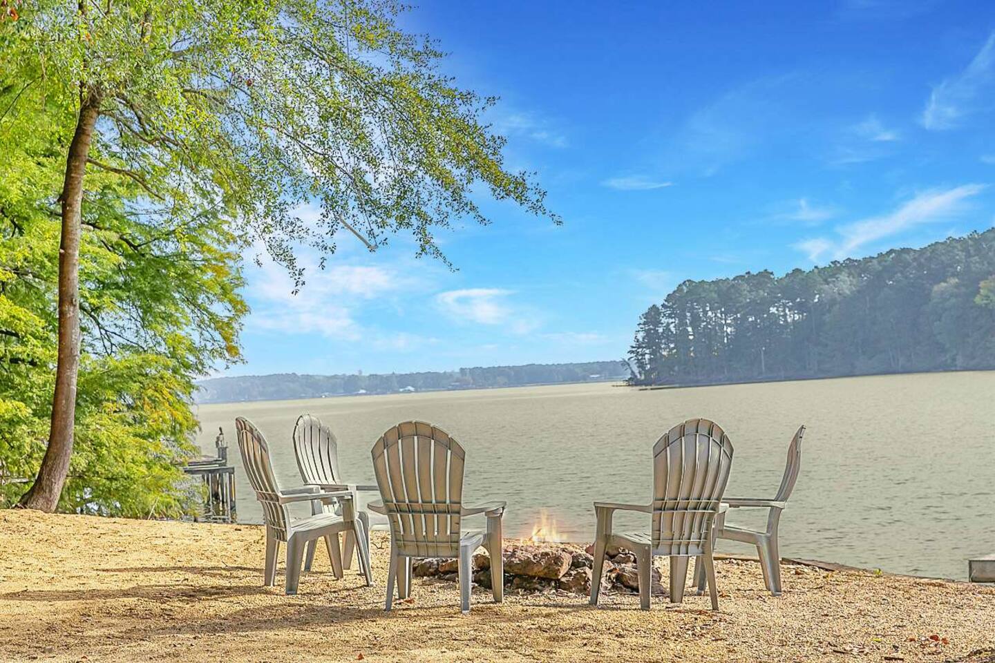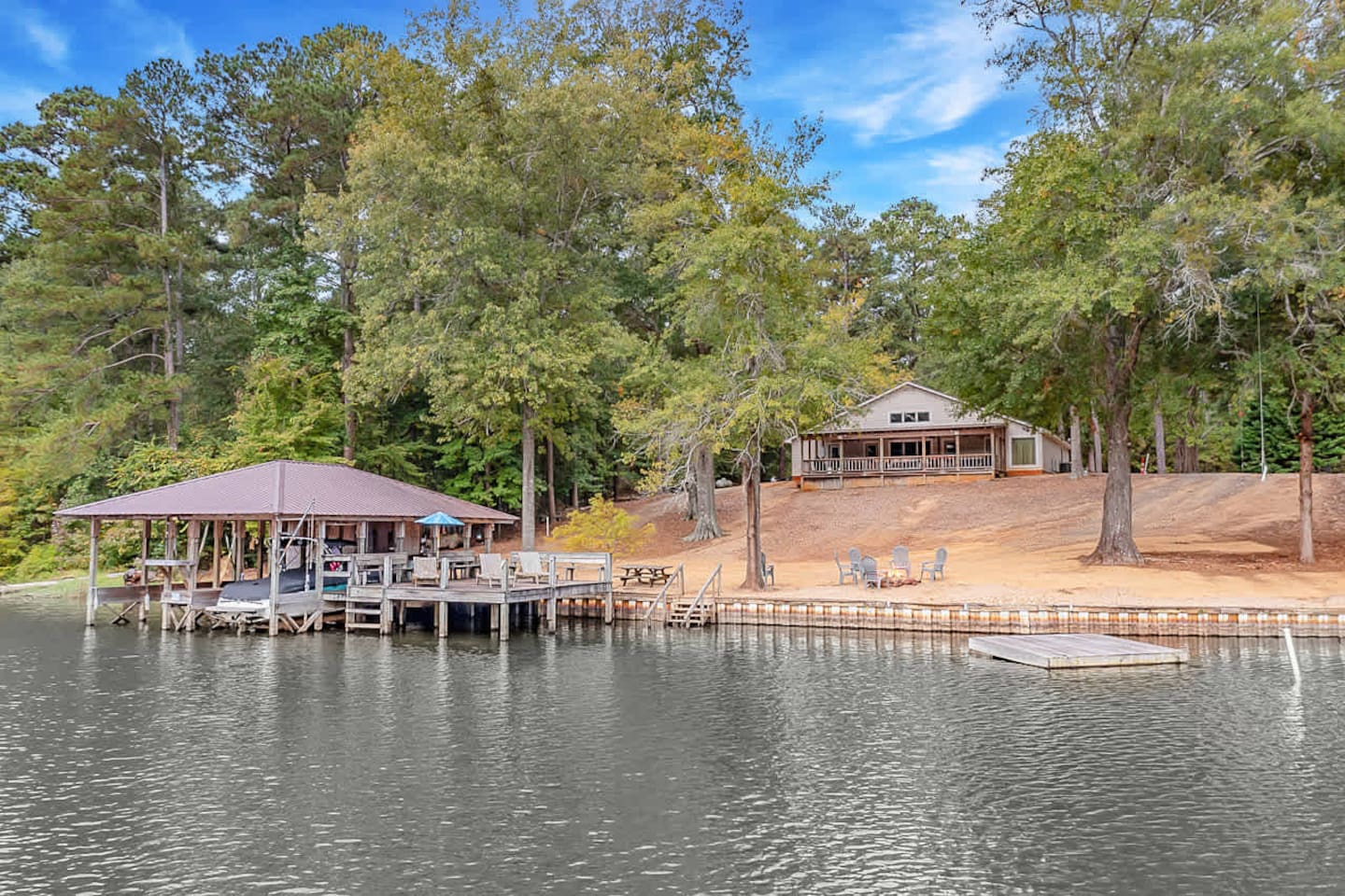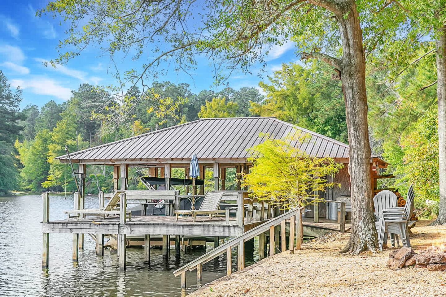 Perfect for family gatherings, retreats, or large groups, this beautiful 4-bedroom getaway comfortably sleeps up to 20 guests. The home is designed for convenience, featuring double washers and dryers and two full-size refrigerators—ideal for extended stays or feeding a crowd. Enjoy outdoor living at its best with an extra-large covered porch, plenty of seating on the dock overlooking the water, and a fire pit that’s perfect for evening hangouts under the stars. Whether you’re relaxing by the la