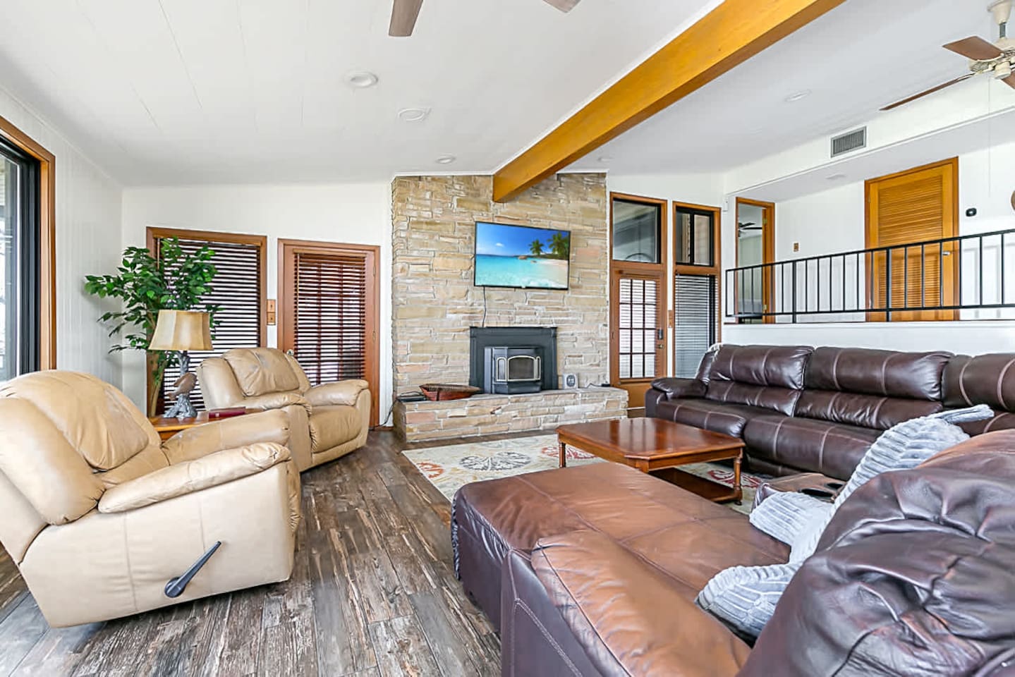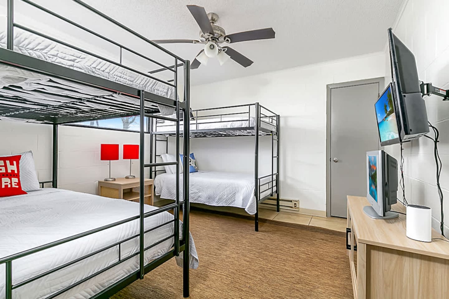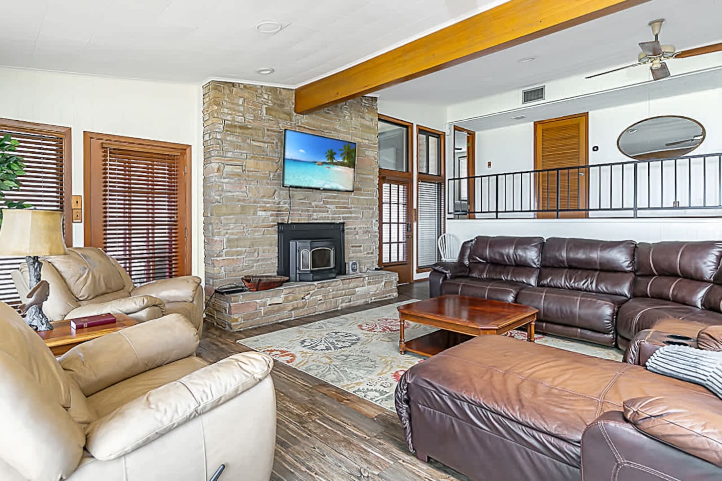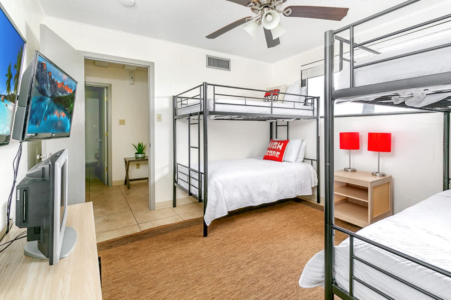 The space offers 5 full bedrooms and 5 full bathrooms. The downstairs unit has a King and a Twin over Queen Bunk that is a great spot for a small family. The downstairs bunkroom offers 2 bunk beds with multiple tv's and video games. The 3 upstairs bedrooms offer a direct on suite bathroom.