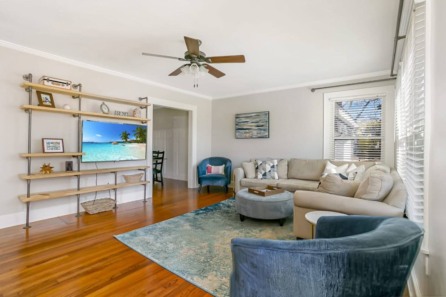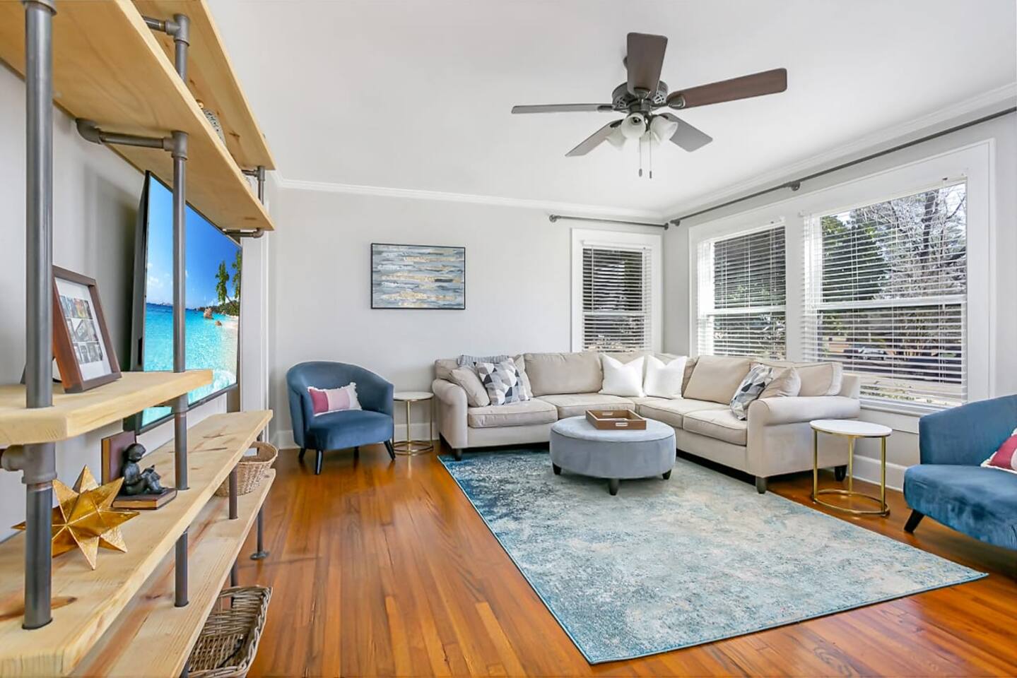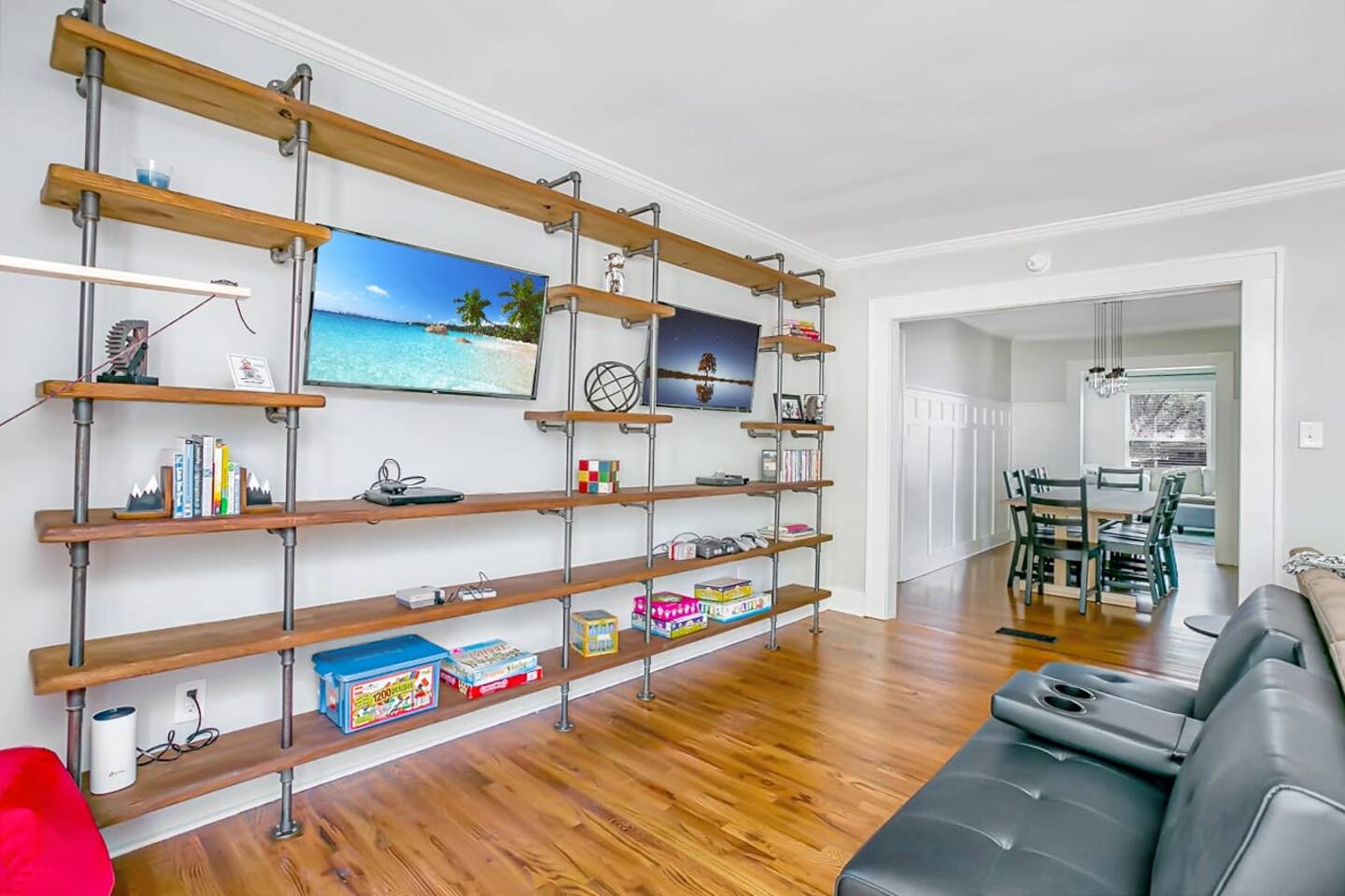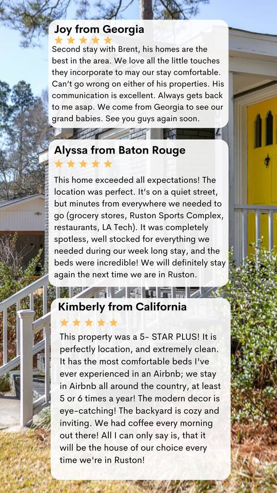 Charming remodeled cottage in the heart of Ruston, just 2 miles from downtown, Louisiana Tech, Ruston Sports Complex, and Tech’s south campus. Sleeps 8 with 3 bedrooms (2 Kings, 1 Queen + bunks) and 2 baths. Enjoy 6 TVs (3 in the game room), blazing-fast Wi-Fi, and a fully stocked kitchen with stainless appliances, quartz counters, and coffee options for any style. Extras include snacks, bottled water, games, Community Coffee, and local Ruston/LaTech decor throughout!